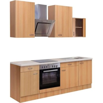 Zwei 89 cm hohe Hängeschränke und ein 55 cm hoher Hängeschrank mit bis zu zwei Einlegeböden bieten reichlich Platz für Geschirr und Gläser. In zwei Unterschränken mit Schublade und einem Einlegeboden finden Besteck, Töpfe und/oder Vorräte ihren Platz. Auch im Spülenunterschrank mit eingebauter Edelstahlspüle steht genügend Fläche zur Verfügung, um noch mancherlei Küchen- und Putzutensilien zu verstauen. Und wenn es wirklich einmal mehr werden sollte, können Sie Ihre Küche einfach mit weiteren Schränken aus der Serie erweitern.