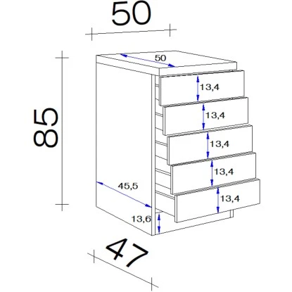 Der 50 cm breite Schubkastenschrank weiß durch eine hochwertige Verarbeitung sowie Materialauswahl zu gefallen und garantiert Ihnen auch auf kleinen Flächen eine Vielzahl von Stauraummöglichkeiten. In insgesamt fünf Schubkästen finden Ihre Küchenutensilien ihren passend Platz.
