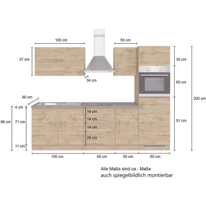 Die Küchenzeile wird Ihnen zerlegt und ohne Dekoration bis zu Ihrer gewünschten Verwendungsstelle geliefert. Die Anordnung der Küchenelemente und die Anschläge der Türen sind somit für Sie frei wählbar. Die Arbeitsplatte wird ohne Ausschnitte geliefert. Technische Änderungen und Irrtümer vorbehalten