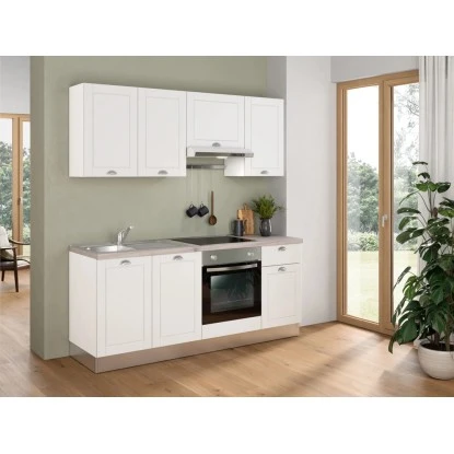 Ob erste Wohnung, Single-Haushalt oder Ferienwohnung die 195 cm Breite Küchenzeile Anastasia überzeugt durch ihr klassisches Landhaus Design, die vielfältigen Funktionen und die bereits integrierten Elektrogeräte. Jede Art von Mahlzeiten lassen sich schnell dank dem Einbauherd-Set mit Backofen, Glaskeramikkochfeld und Wandhaube zubereiten. Die Schränke werden vormontiert geliefert, dadurch sparen Sie Zeit und zusätzliche Kosten beim Aufbau. Die hochwertigen und pflegeleichten MDF-Fronten und die stabile Bauweise der Schrankkörper garantieren Ihnen lange Freude an Ihrer Küche.