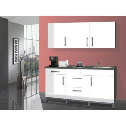 Die Menke Küchenzeile Rack-Time I mit einer Breite von 180 cm überzeugt mit moderner Optik und ein unschlagbares Preis-Leistungsverhältnis. Die Küche besticht insbesondere durch die Kombination aus Design, Funktion und Robustheit. Alle Möbelteile werden in Deutschland gefertigt und zeichnen sich durch hochwertige Qualität aus. Die teilweise mit Metall-Schubladen ausgestatteten Unterschränke und die Oberschränke bieten viel Stauraum für Ihre Küchenutensilien. Die Scharniere sind mit Dämpfung ausgestattet. Alle Unterschränke werden auf einem Metallgestell montiert. Die Küchenzeile besteht aus Spüle mit Unterschrank, einem Unterschrank mit Schublade, sowie einem Topfschrank und einer Glaskeramik-Doppelkochplatte, sowie 3 Oberschränken. Die Arbeitsplatte wird ohne Ausschnitte in einer Stärke von 38 mm geliefert.
