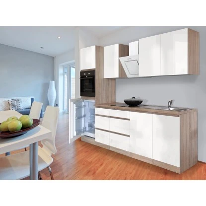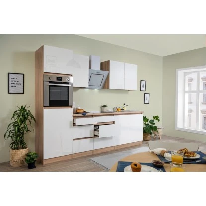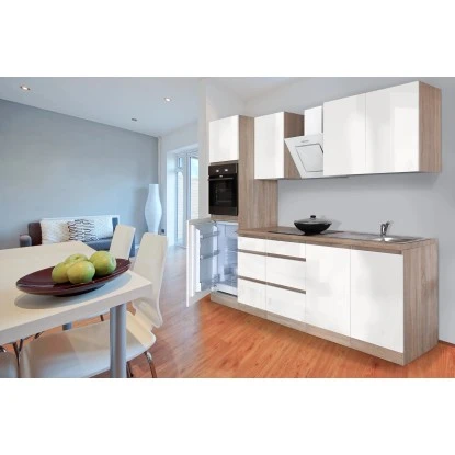 Respekta Küchenzeile GLRP270HESW Grifflos 270 Cm Weiß Hochglanz-Sonoma Eiche