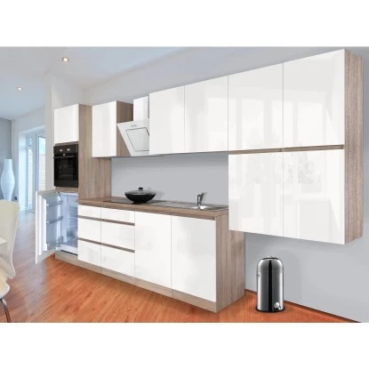Respekta Küchenzeile GLRP370HESW Grifflos 370 Cm Weiß Hochglanz-Sonoma Eiche